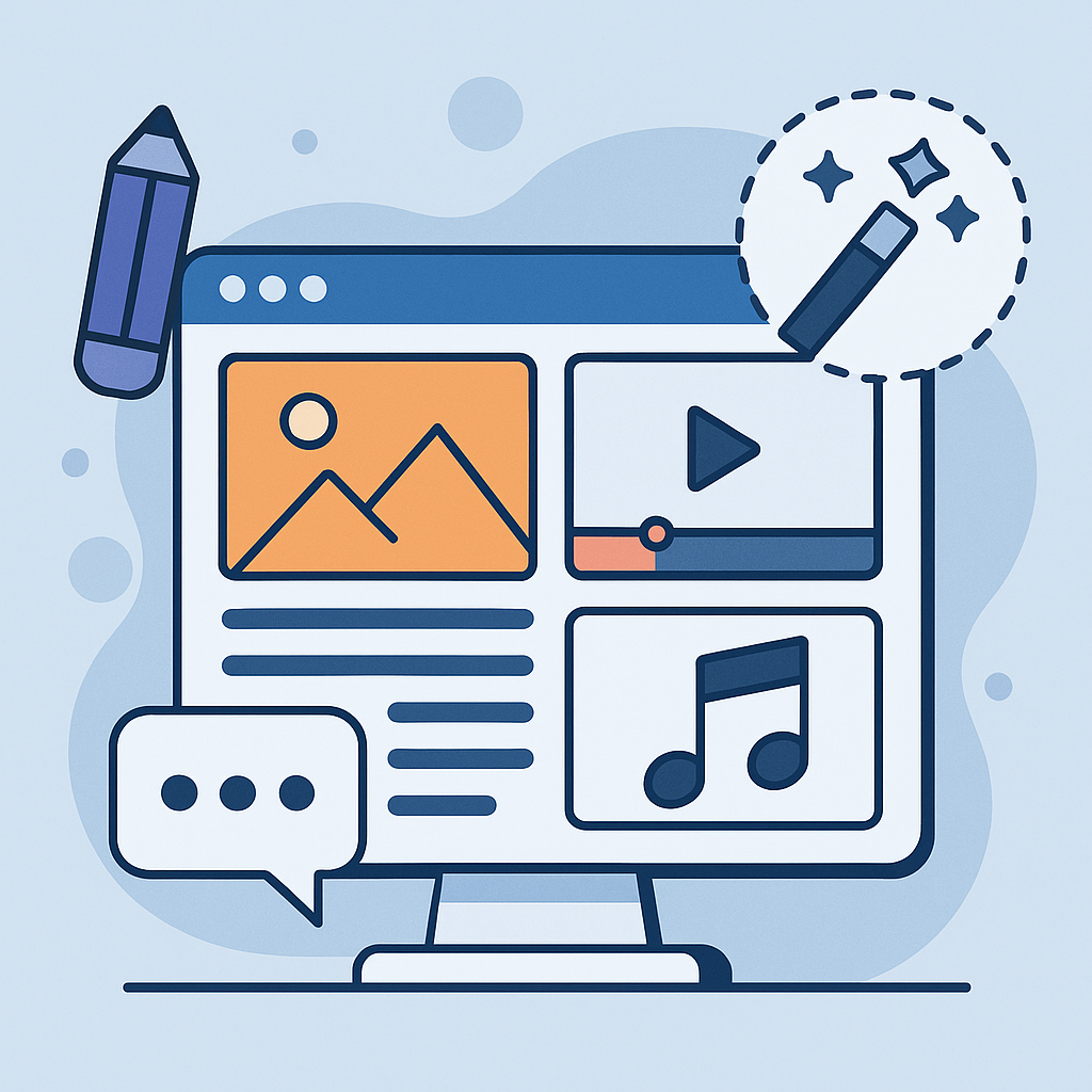 Creรซer professionele visuals, videoโs en audiofragmenten met behulp van AI โ zonder dat je een grafisch ontwerper, cameraman of audiotechnicus hoeft in te schakelen. Je levert input aan in de vorm van tekst, themaโs of voorbeelden en onze AI doet de rest.